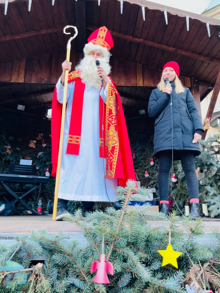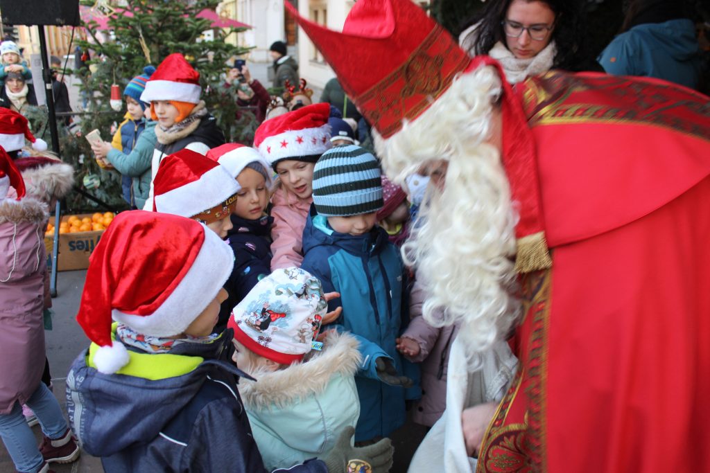 Im Interview mit der Moderatorin erzählte der Nikolaus etwas über seine Person, bspw. wo er herkommt, wie alt er ist, was seine Kleidung bedeutet oder warum am 6. Dezember sein Gedenktag ist. Auf ihre Frage: „Warst du heute schon bei allen Leuten? Habt ihr alle heute was in euren Schuhen gehabt?“, schallte ein lautes „Ja!“ von Jung und Alt über den Markt. „Ja, war viel Arbeit“, befand der alte Mann. Im Anschluss las er eine Geschichte vor, in der es um ein Kind, einen Teddybär und einen Spielzeughändler ging. Und darum, dass „wirklich jeder ein Nikolaus sein kann. Manchmal reicht schon eine kleine Tat, um ein Herz hell leuchten zu lassen“.