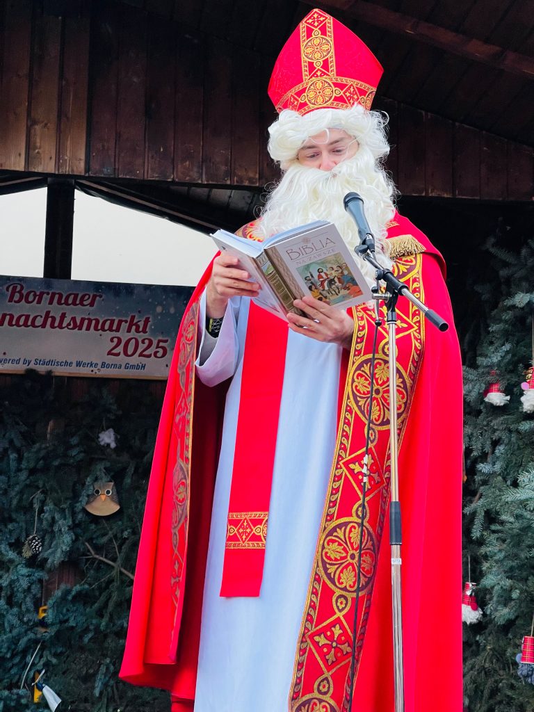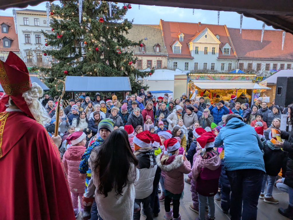 Es dauerte etwas, aber schließlich hatte der Nikolaus seinen Weg zu den wartenden Kindern und Eltern gefunden. Auf Einladung der Stadt, der evangelischen Kita und der katholischen Gemeinde besuchte er wieder den Bornaer Weihnachtsmarkt. Und er hatte an diesem Tag bereits eine lange Reise hinter sich. Zur Begrüßung zeigten die „Marienkäfer“ noch einmal ihren Nikolaustanz, sehr zur Freude des Bischofs.